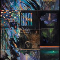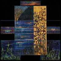 Elizabeth Myers Castonguay has spent a lifetime observing, researching, and making artwork about her passions: human diversity and the preservation of nature. Over the past fifteen years, the number of endangered species has risen from 40,000 to over one million. The artist’s paintings often depict humanity monochromatically with the endangered species in full color. Every species is critically important to the fine balance of nature though many cultures have an anthropocentric philosophy. Castonguay’s paintings are often divided into sections because all living beings are complex and sentient as scientists continue to discover. Colorful grids represent images of DNA common to all life forms.
