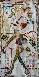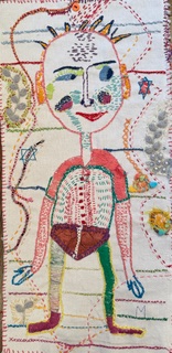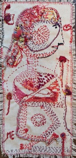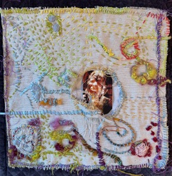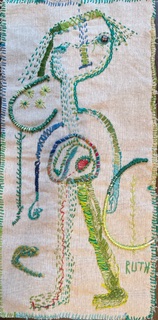 Tamar, my ninety-two-year old mother. Macey, her loving carer. Dvora, my dear sister-in-law. Ortal, my friend. And me. As the sirens wailed, bombs fell and the walls shook, as ‘Play’ the border collie shivered in the corner, our hands flew. Calming hands, guiding needles and thread. Bright colors, crazy thoughts, odd figures, our minds aflame, seeking beauty, seeking solace. Shutting out the horror, we found new ways of seeing.This is our response to a world gone mad: sisterhood, humor, and beauty.