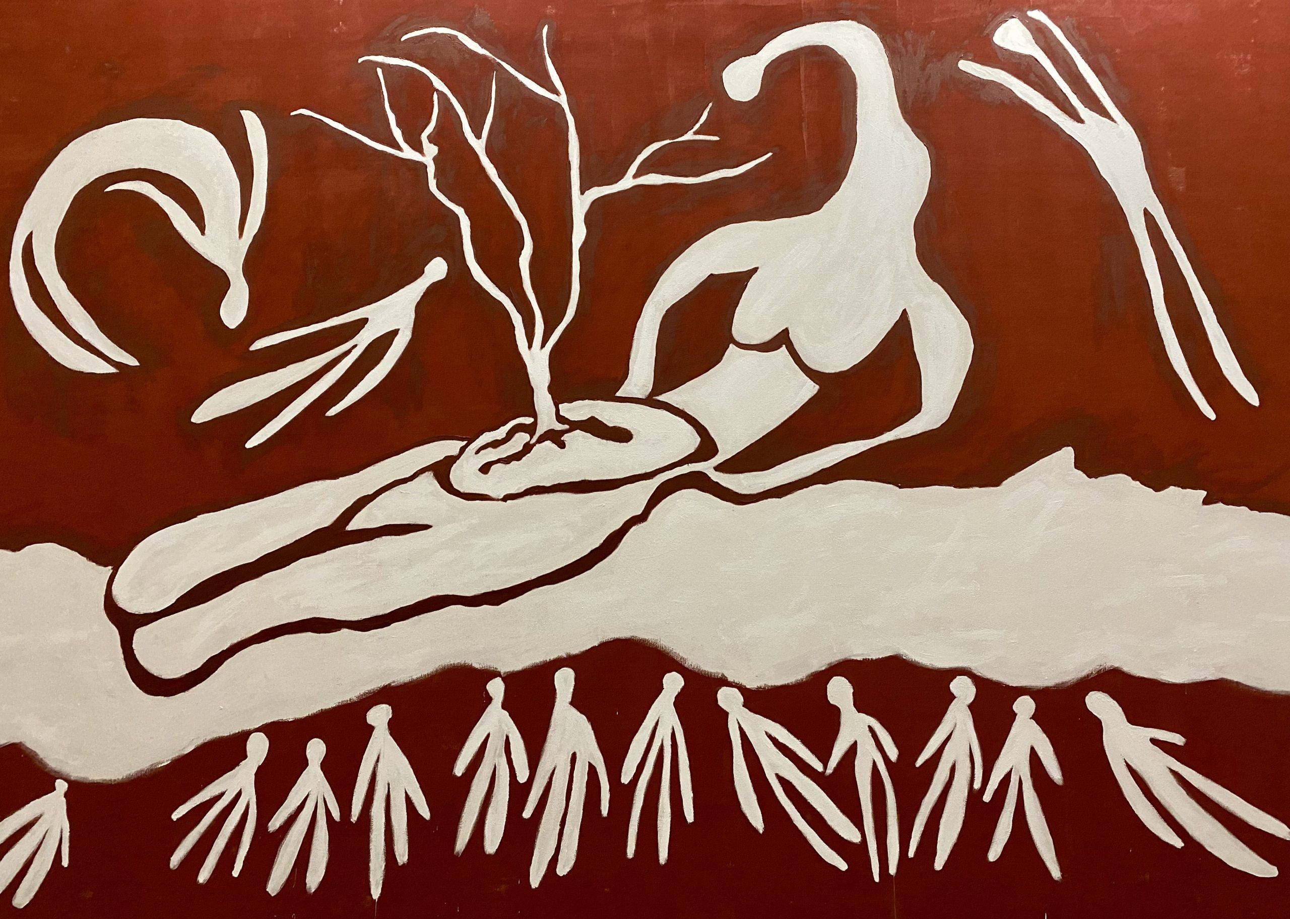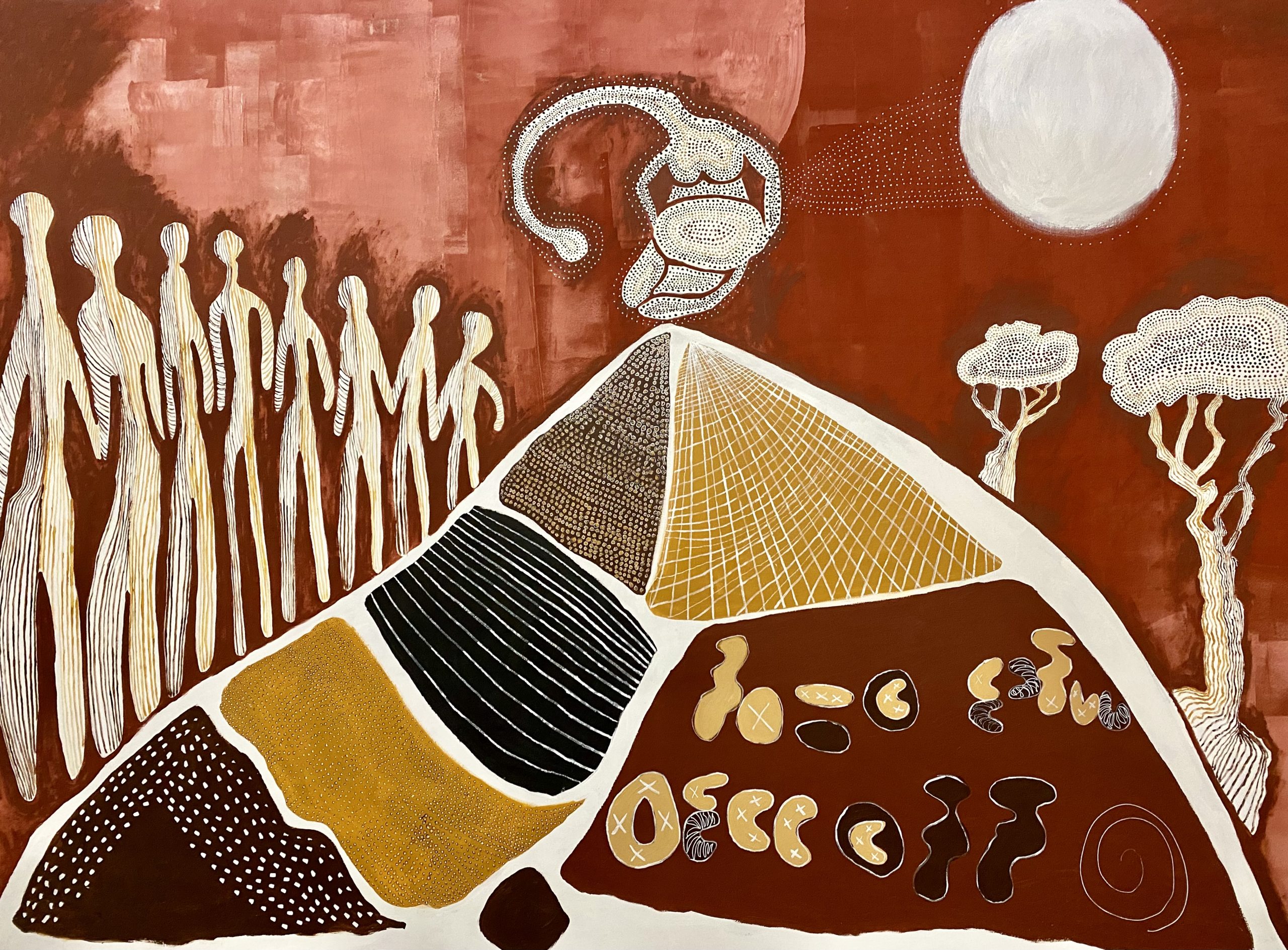 While doing doctoral research, I had the immense pleasure of looking at a vast collection of Aboriginal bark paintings in the collection of The American Museum of Natural History in NYC. My professor at that time recognized my passion for Aboriginal art and challenged me to make a painting in the Aboriginal style but with my own symbols and stories.